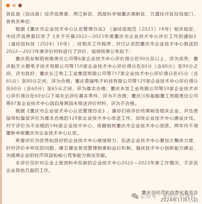 11月15日,重慶市經(jīng)濟和信息化委員會發(fā)布《重慶市企業(yè)技術(shù)中心2022—2023年度評價結(jié)果》,其中6家企業(yè)評分90分以上為優(yōu)秀;159家企業(yè)評分80分以上為良好;717家企業(yè)評分在65分以上為合格;129家企業(yè)評分在60-65分之間為基本合格;59家企業(yè)在60分以下為不合格。我公司獲得82.1評分為良好,序號排名96。